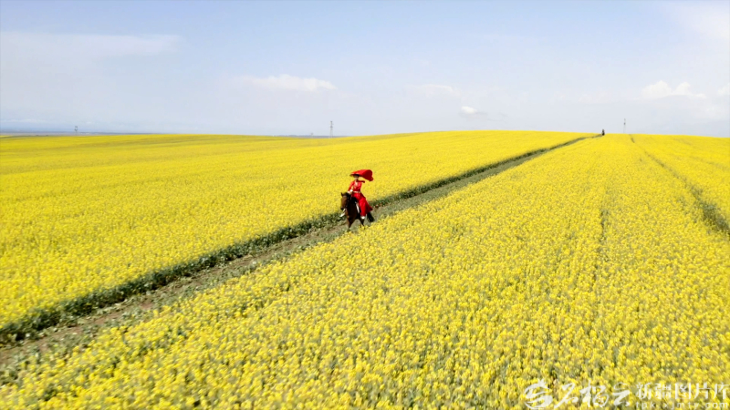 2022年贺娇龙策马奔腾在昭苏油菜花田里。图/新疆图片库提供